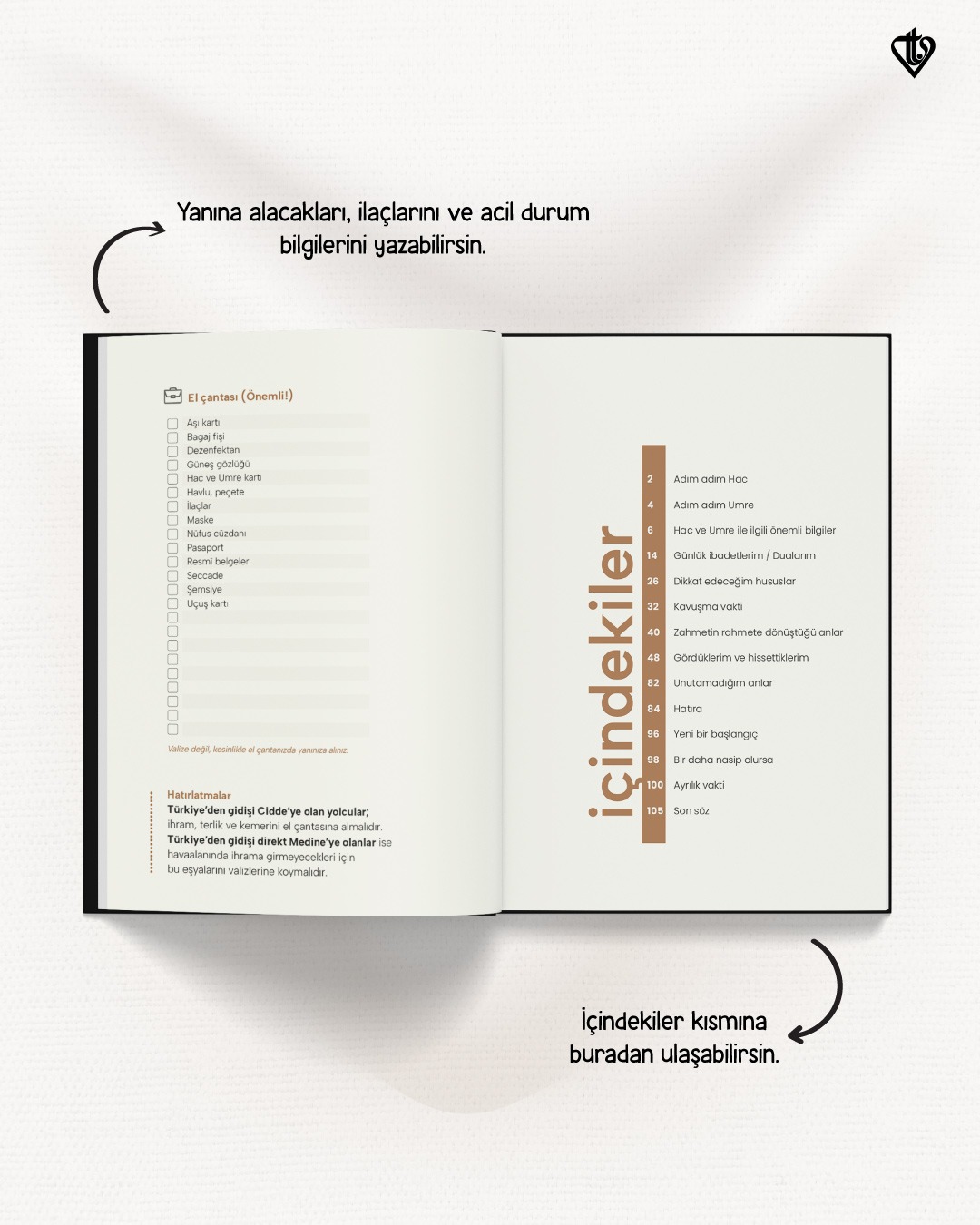 “Hac ve Umre Defteri”, ibadet yolculuğunuzdaki anılarınızı kaydedebileceğiniz, unutulmaz bir hatıra defteri olarak saklayabileceğiniz özel bir tasarıma sahip. Bir bütün olarak hac ve umre yolculuğunuzun başından sonuna yapılacakları adım adım açıklayan defter, hem öğretici bir rehber hem de bir hatırat niteliğinde.