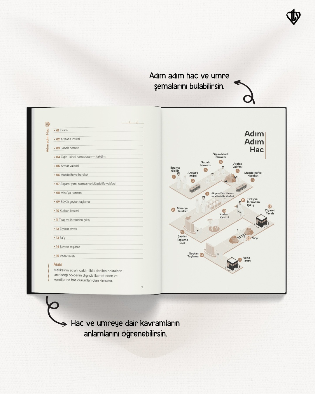 Adım Adım Hac ve Adım Adım Umre şeklinde bölümlere ayrılmış defterde bu ibadetlerin tüm aşamaları hakkında bilgiler bulunuyor. İbadetlerinizi eksiksiz ve doğru bir sıralama ile yerine getirmenizde pratik bir yardımcı niteliğindeki bu defter ile ziyaretlerinizi gün gün planlamanız kolaylaşıyor.