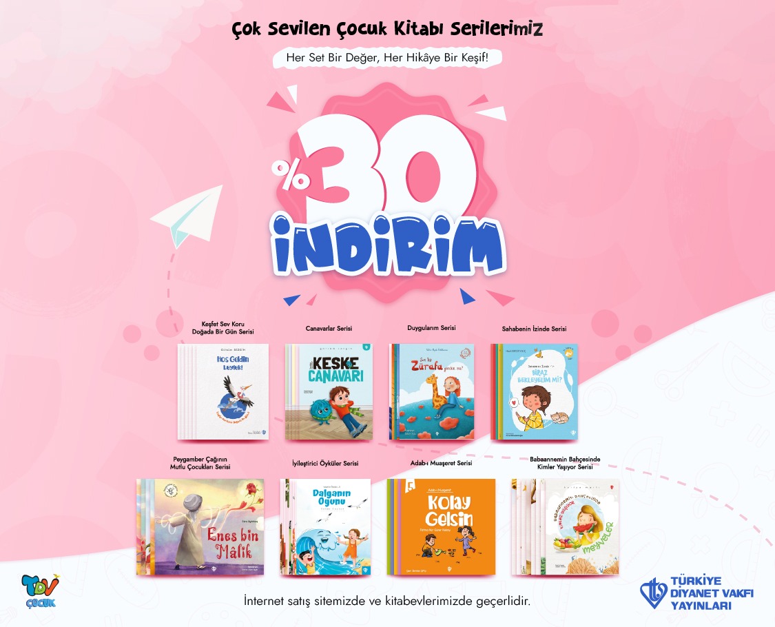 İslam kitapları ve hediyelik ürünleriyle olduğu kadar çocuk kitapları ve genç kitapları serileri ile geniş bir külliyat oluşturan Türkiye Diyanet Vakfı Yayınları’nda bu serilere %30 indirim tanımlanmış. Siz de çocuk kitapları serilerini yakından incelemek ve satın almak için TDV e-satış sitesi ve TDV Kitabevlerini ziyaret edebilirsiniz.